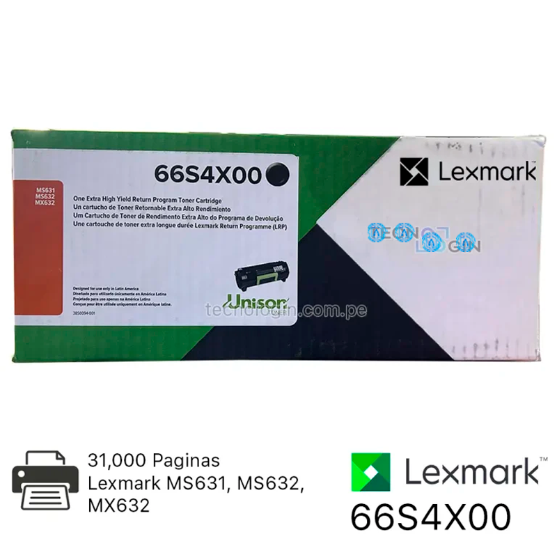 Toner Lexmark 66S4X00 Negro con tecnología de Impresión láser monocromático Rendimiento Promedio del Cartucho en uso continuo, impresión simple lado, declarado de acuerdo con ISO/IEC 19752. Cartuchos de repuesto: Los toner están diseñados para su uso en una región geográfica específica. Esencial para el rendimiento del sistema de impresión Lexmark, la fórmula única del tóner Unison proporciona una calidad de imagen consistentemente excelente, garantiza la confiabilidad del sistema de impresión de larga duración y promueve una sostenibilidad superior en un innovador sistema de impresión estabilizado. el toner esta diseñado para los siguientes modelos de impresora compatibilidad: Lexmark® MS631, MS632, MX632